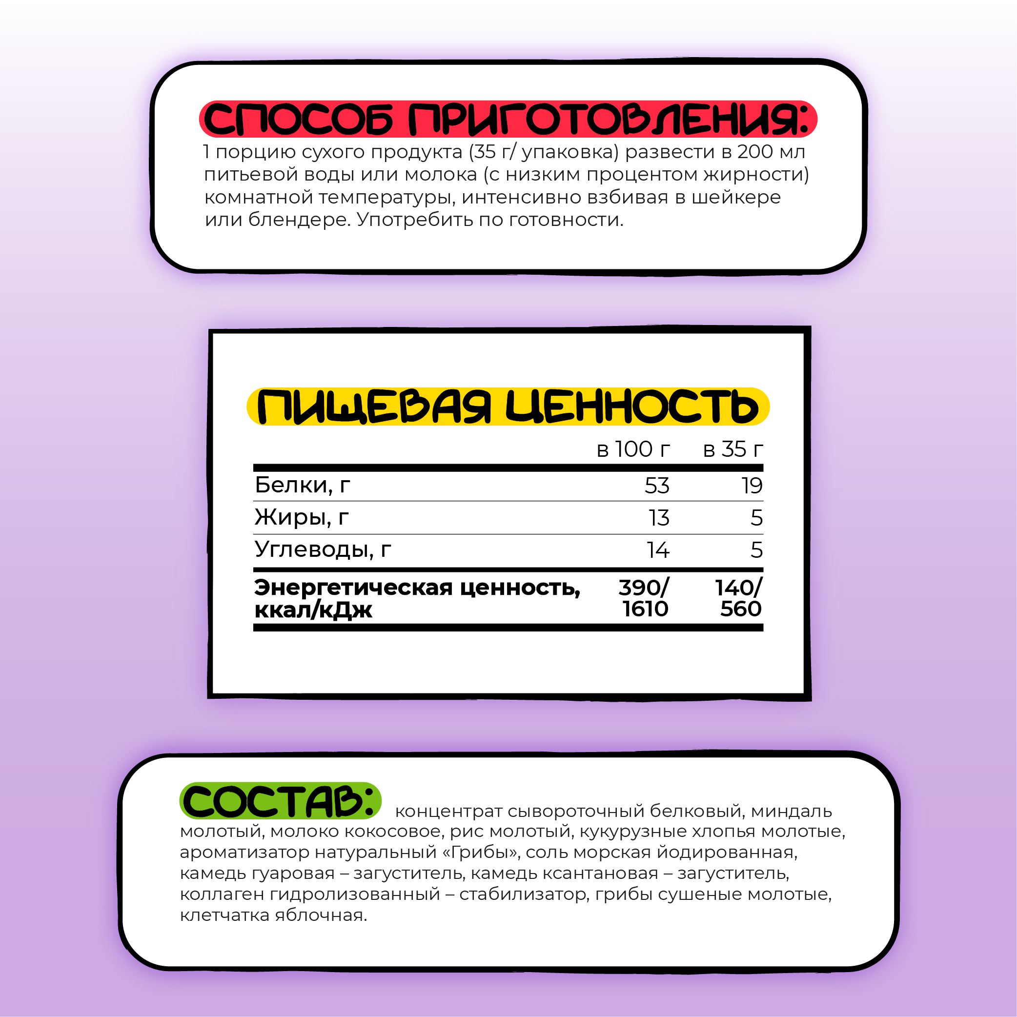 концентрат сывороточный белковый, миндаль молотый, молоко кокосовое, рис молотый, кукурузные хлопья молотые, ароматизатор натуральный «Грибы», соль морская йодированная, камедь гуаровая - загуститель, камедь ксантановая - загуститель, коллаген гидролизованный – стабилизатор, грибы сушеные молотые, клетчатка яблочная.